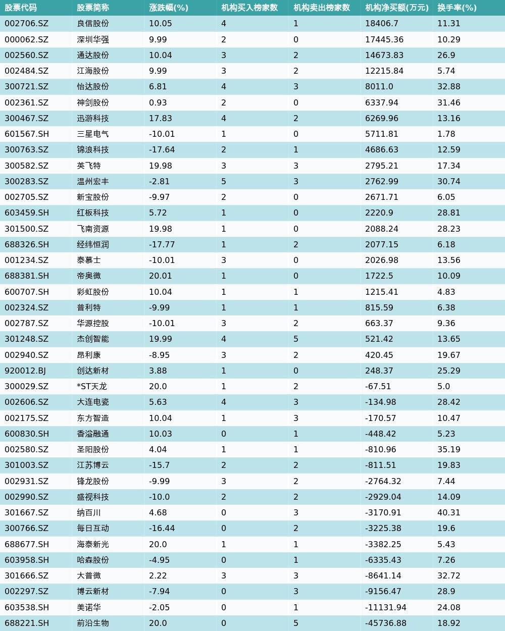 南财智讯4月27日电,盘后数据显示,因当日异动登上龙虎榜的个股中靠谱的配资平台有哪些,39只沪深A股龙虎榜出现了机构的身影靠谱的配资平台有哪些,机构合计净买入17091.65万元,具体来看,机构净买入23只个股,净卖出16只个股。其中,机构净买入前三分别为良信股份(002706.SZ)、深圳华强(000062.SZ)与通达股份(002560.SZ),详情见下图:机构净卖出的个股中,前三分别为前沿生物(688221.SH)、美诺华(603538.SH)与博云新材(002297.SZ)。