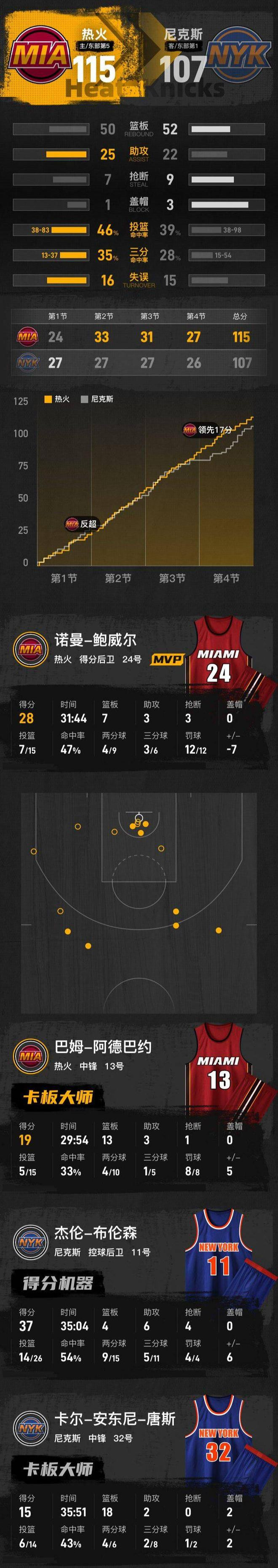 【UC体育战报】北京时间10月27日NBA常规赛,主场作战的热火以115-107击败尼克斯。阿德巴约19分13篮板3助攻,唐斯15分18篮板2助攻。