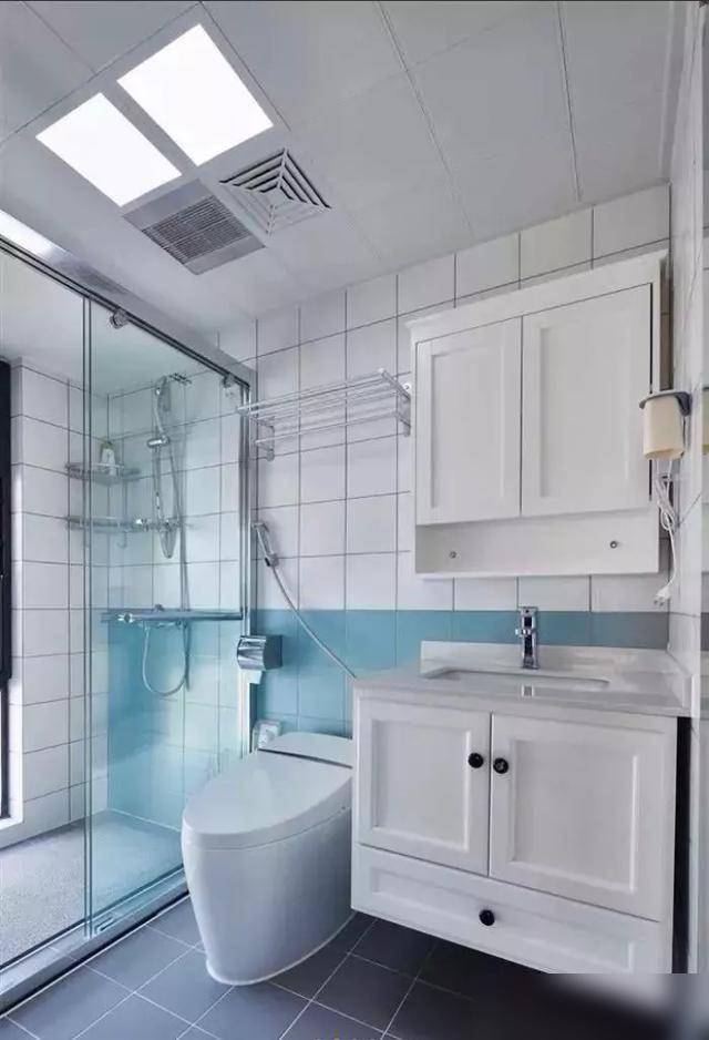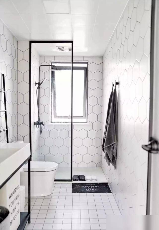 这种户型别乱装,直接按“洗手台-马桶-淋浴区”一字排开,中间用玻璃隔断把淋浴区单独隔出来。