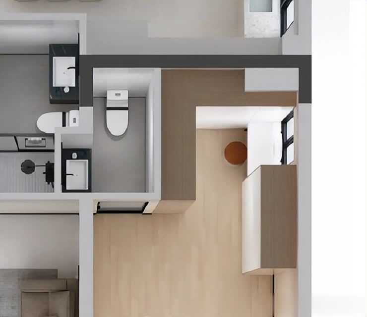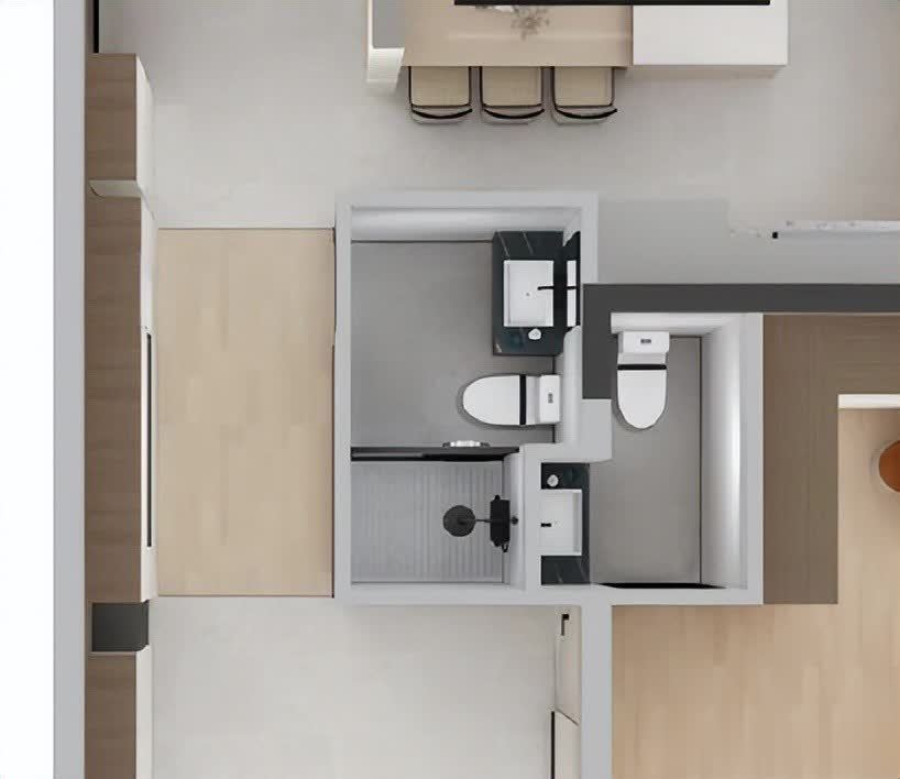 卫浴革新:采用三分离设计,干区配备双台盆(长度120cm)与镜柜储物系统;湿区配置钻石型淋浴房(900900mm)与入墙式马桶;家政间采用隐形折叠门设计,整合清洁工具收纳。