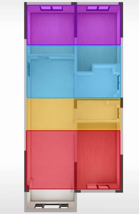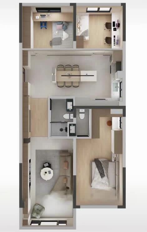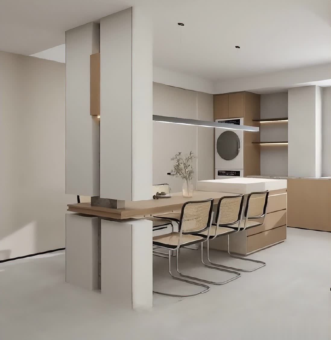 本案例为建筑面积56㎡的南北向长条形户型,原始布局存在空间利用率低、动线冗长等问题。业主需求包括两间常住卧室+多功能书房、开放式大厨房、主卧独立卫浴系统及衣帽间。设计团队通过横向四段式空间重组策略,结合功能复合与动线优化,成功破解了长条户型的空间难题。