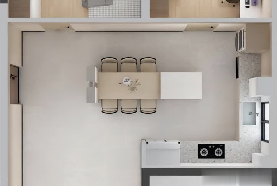 餐厨核心:4.2米环形操作台面,包含高低台面设计,集成了电磁炉灶区(台面高度80cm)和水槽区(台面高度90cm),提升烹饪体验。