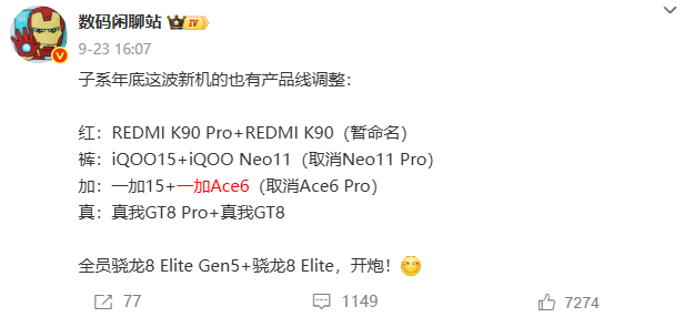 近日,知名博主@数码闲聊站 发博文透露:“子系年底这波新机的也有产品线调整:①红:REDMI K90 Pro+REDMI K90(暂命名);②裤:iQOO15+iQOO Neo11(取消Neo11Pro);③加:一加15+一加Ace6(取消Ace6Pro);④真:真我GT8 Pro+真我GT8。全员骁龙8 Elite Gen5+骁龙8 Elite,开炮”。对于加粉来说,属实没想到配资公司选配资配资,现在一加的产品线这么明朗了。